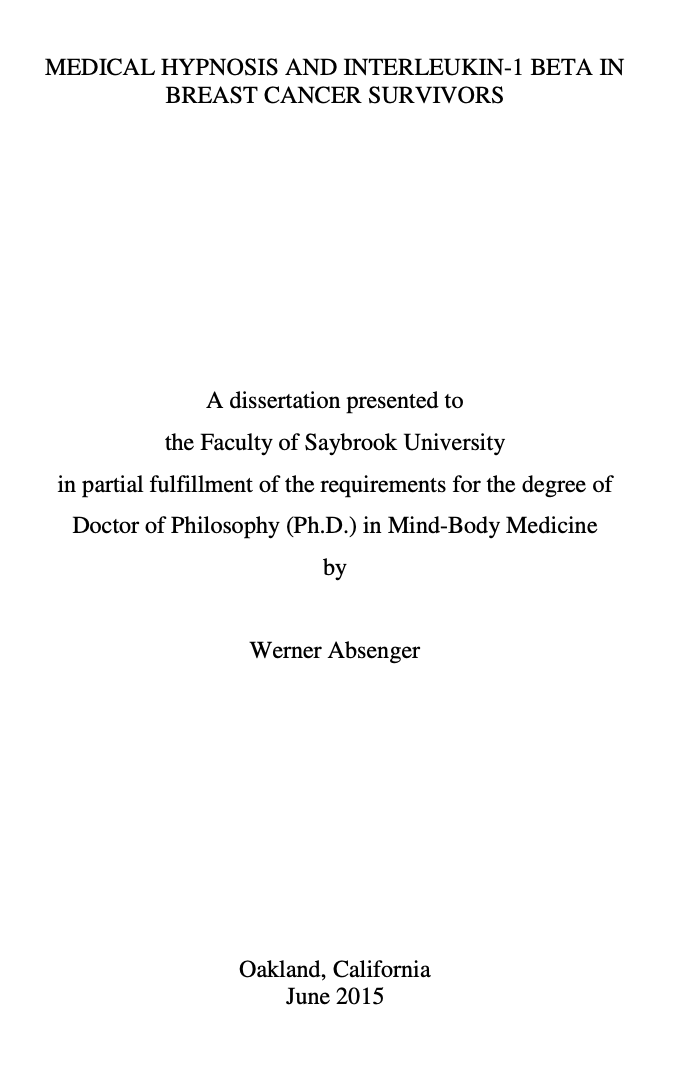 Medical hypnosis and interleukin-1 beta in breast cancer survivors. [Dissertation, Saybrook University].